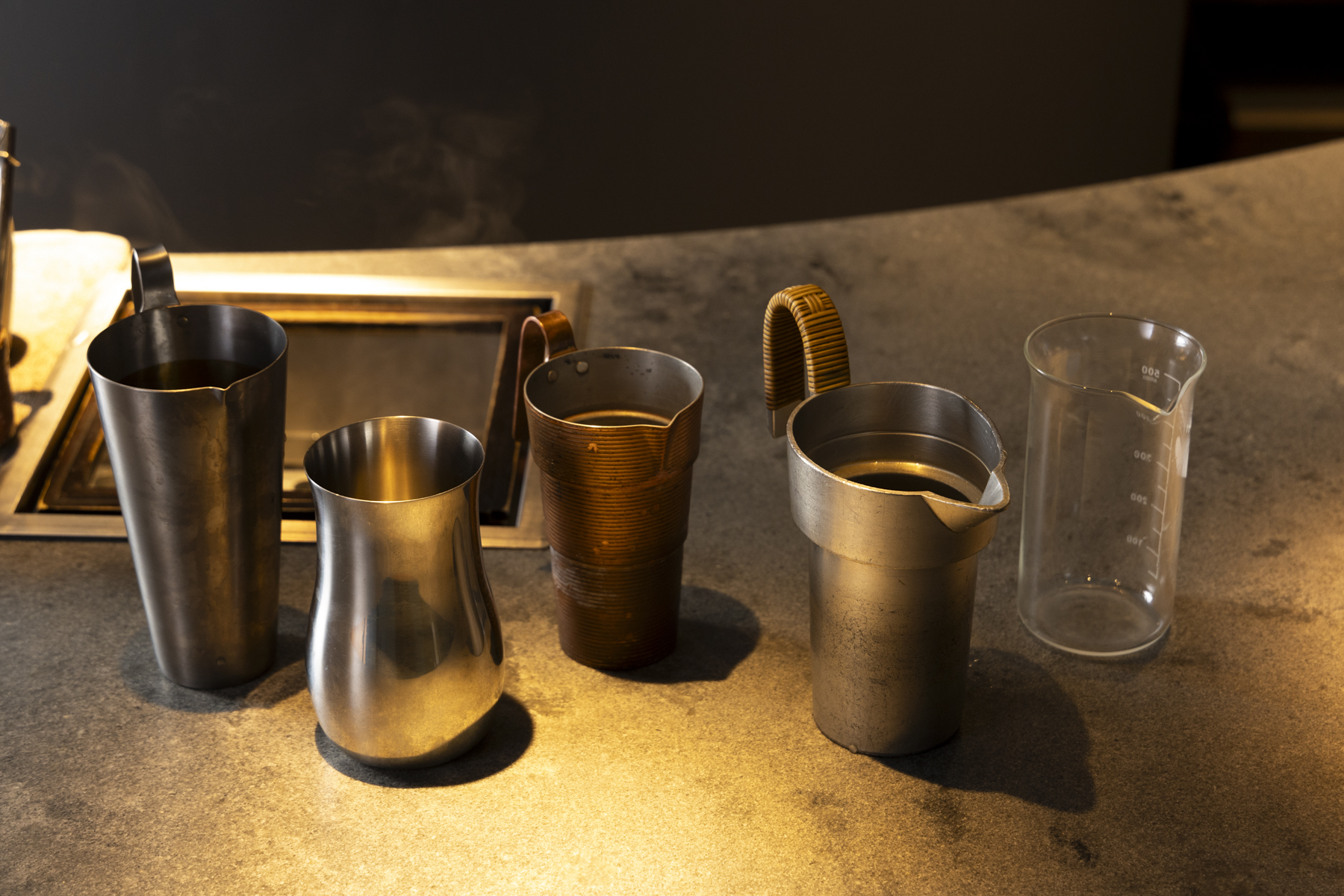 On the counter are two kandoko (vessels for water baths), one at 60°C and one at 90°C. He warms sake using five types of vessels, including copper chirori (sake pitchers), which are said to have the best thermal conductivity and enhance crispness. "If you compare it to cooking," he explains, "copper is 'grilling.' Tin is 'simmering,' a beaker is 'steaming,' a stainless steel decanting vessel is 'deep-frying,' and titanium is 'wood-fire cooking.' I warm the sake by imagining a cooking method for each type of vessel."