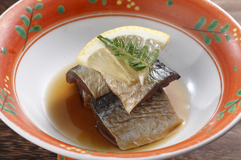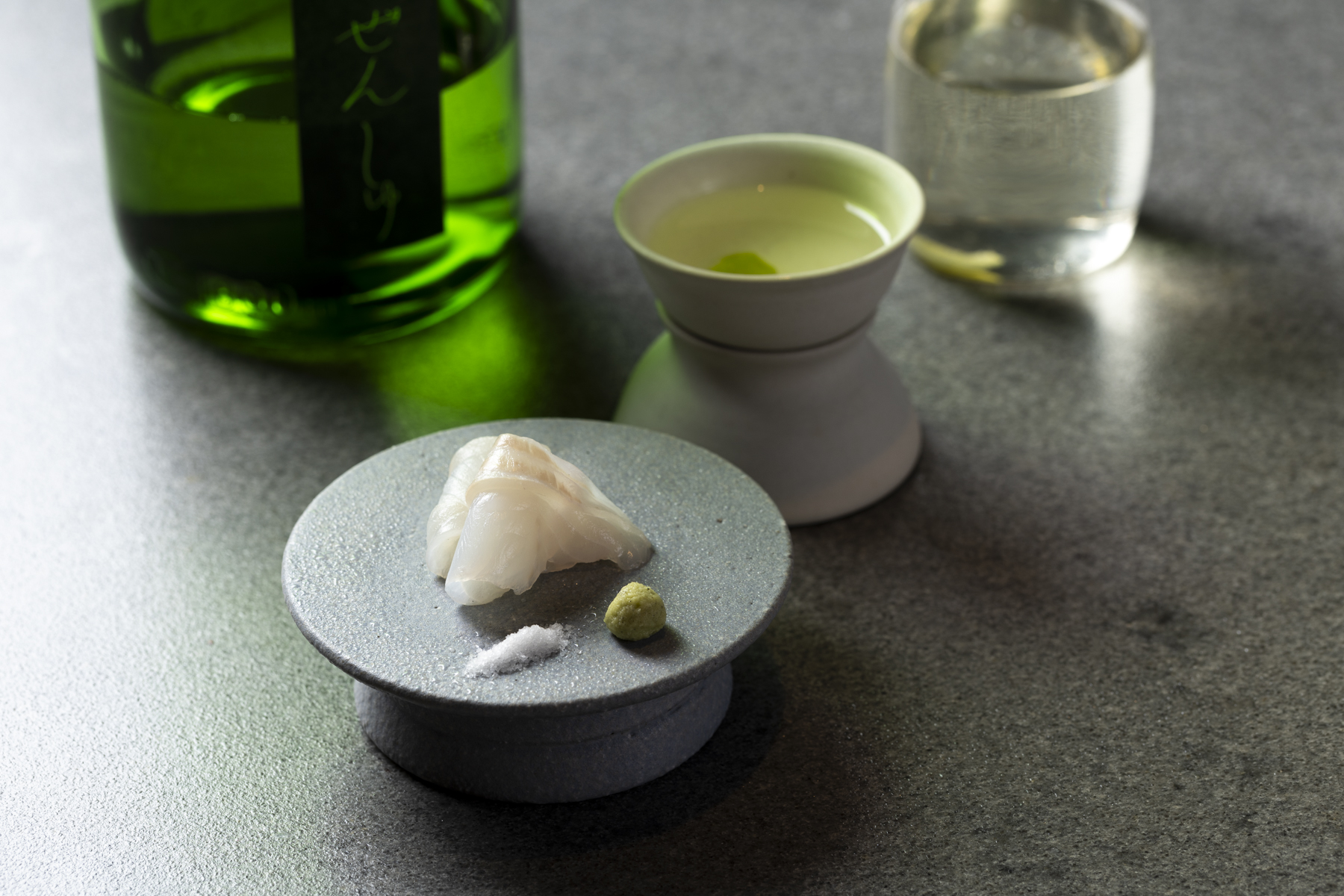 The sake is warmed in a titanium chirori and finished with the peel of a domestic bergamot to add aroma. "The warm sake melts the oils in the sashimi, amplifying the umami. The aroma of the bergamot is refreshing."