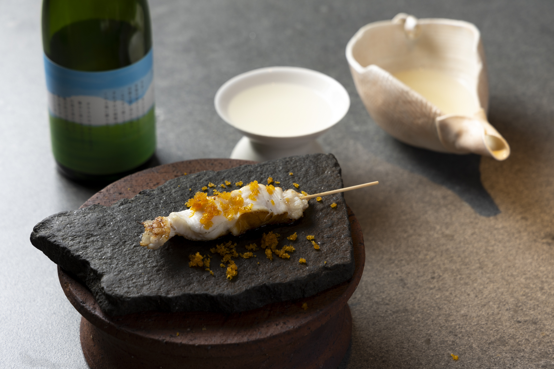 The delicate and clean quality of the sake harmonizes with the light flavor of the slime flounder. It is finished with a generous sprinkling of homemade karasumi (dried mullet roe). "The umami of the karasumi pairs very well with sake," he says. "The smoky aroma from the straw adds another layer."
