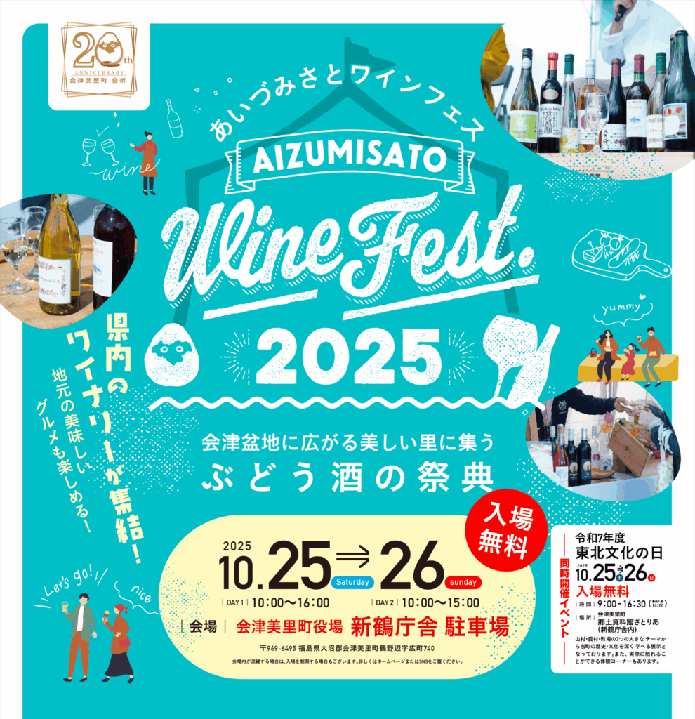〜会津盆地に広がる美しい里に集うぶどう酒の祭典〜「あいづみさとワインフェス」が会津美里町役場 新鶴庁舎駐車場にて、10月25日(土)・26日(日)に開催されます。